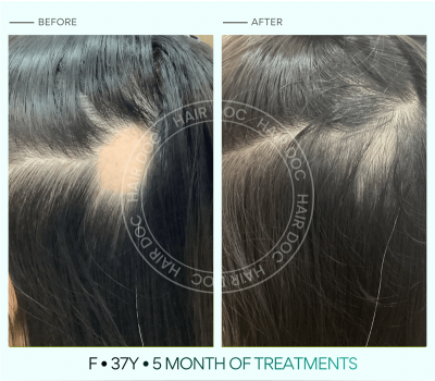 Hair returning in bald-spot areas often starts as fine white or grey strands, and may appear curlier even if the person’s natural hair is straight. This process can be slow — for some individuals it may take many months, and in certain cases even years, for the area to show fuller coverage again.